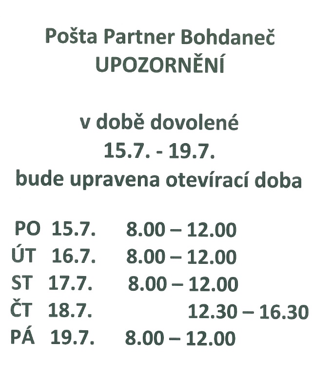 Otevřeno každou středu od 16:00-18:00 hod. Více info v sekci " Obec, Kultura, Knihovna Bohdaneč "