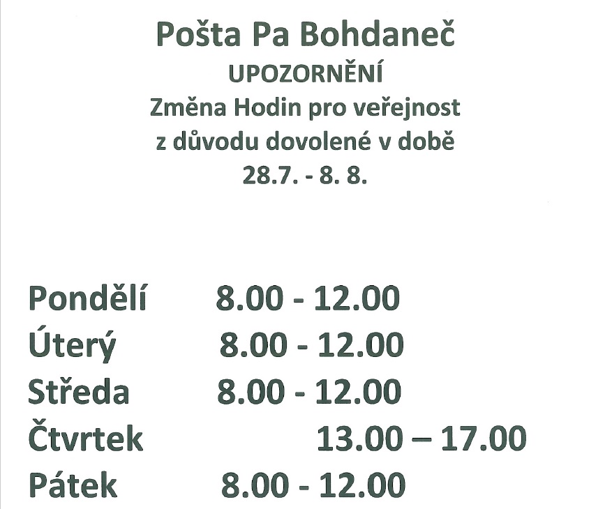 Pošta v Bohdanči oznamuje změnu otevírací doby v důsledku čerpání dovolené od 28. července do 8. srpna. Omlouváme se za případné nepříjemnosti a děkujeme za pochopení.