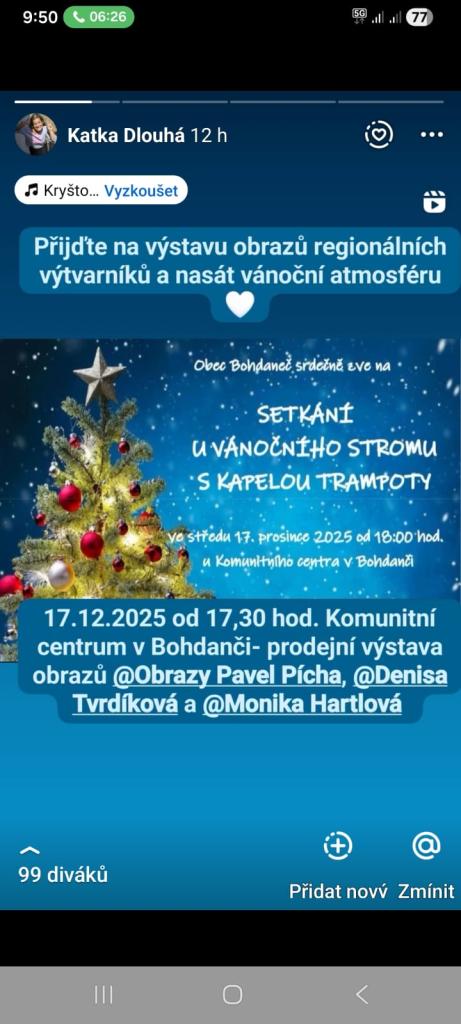 Obec Bohdaneč Vás tímto co nejsrdečněji zve na prodejní výstavu regionálních výtvarníků, která se bude konat dne 17.12.2025 od 17:30 hod. v sále Komunitního centra Bohdaneč a poté je možnost navštívit tuto akci po ukončení programu "Zpívání u vánočního stromu" cca v 19:00 hod. Dále bude výstava přístupná pro veřejnost dne 22.12.2025 v době od 08:00 hod. do 18:00 hod.